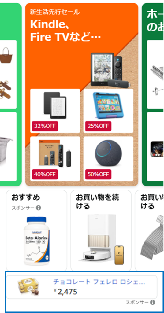 - Amazonデバイス: KindleやFireタブレットのロック画面など。 買い物以外の目的でAmazonのサービスを利用しているタイミングに接触することで、自然な形でブランドの記憶を植え付けます。