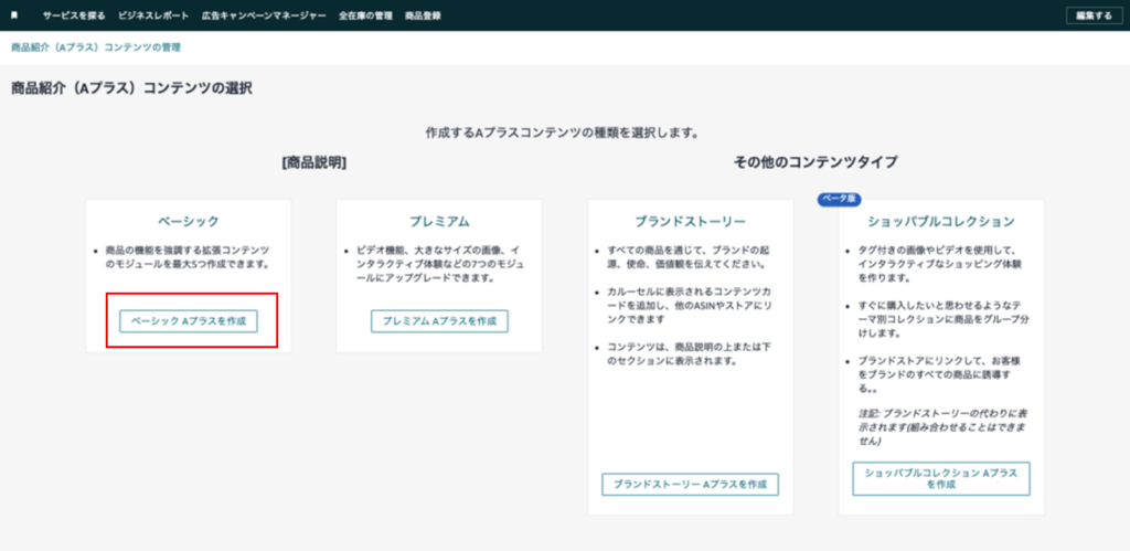 - 「商品紹介(A+)コンテンツの編集」を開く