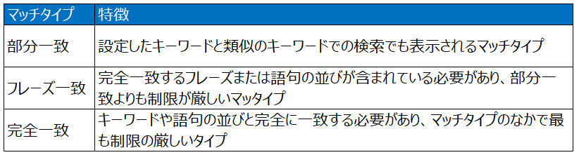 キーワードターゲティングには、露出範囲の異なる3種類のマッチタイプが存在します。