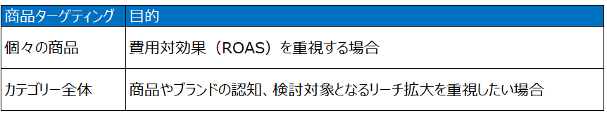 - 費用対効果(ROAS)を重視する場合:個々の商品ターゲティングをメインに設定することが推奨されます