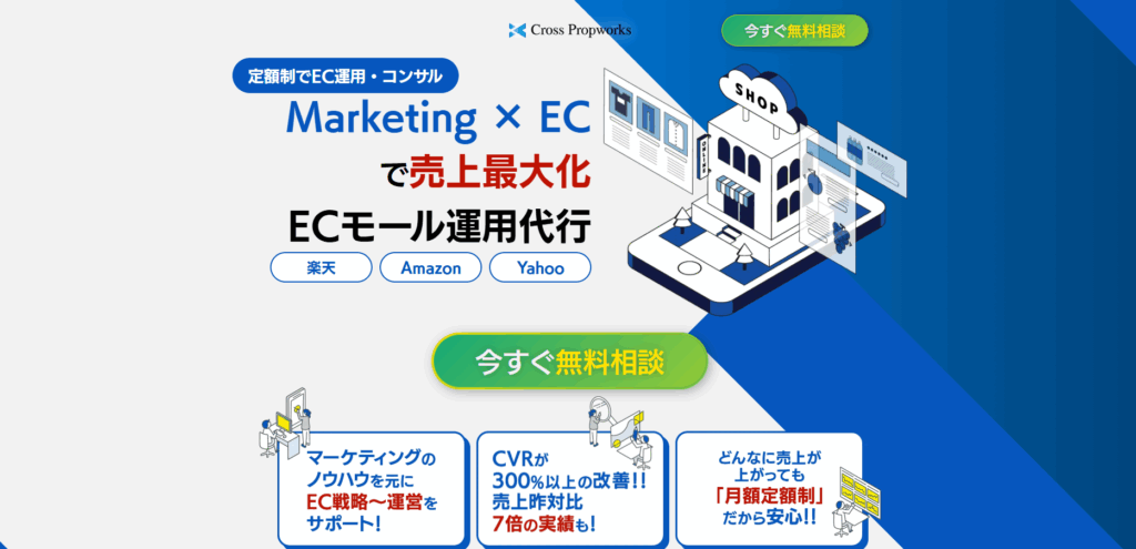| 株式会社クロス・プロップワークス | ECサイトの立ち上げから販促まで | 運用代行プランの「運営まるっと店長プラン」」は月額20万~ | マーケティング目線での運営が特徴のAmazon運用代行 | https://withwork.co.jp/ec_lp_2023/ |