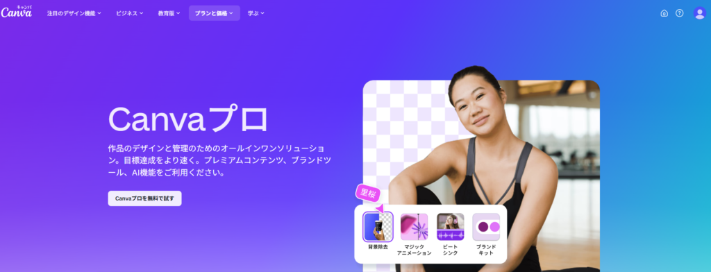 | Canvaプロ | 1,180円 / 月 (年払いの場合は8,300円/年) | ・個人のクリエイター利用に最適 ・160万点以上のテンプレート ・1億4,100万点以上のプレミアム写真・動画・イラスト・音源 ・制作に使える拡張されたAI利用枠 |