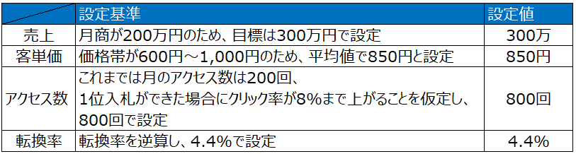 すでに、客単価、アクセス数の目標値が決定していますので、そこから逆算して転換率の目標値を決定します。