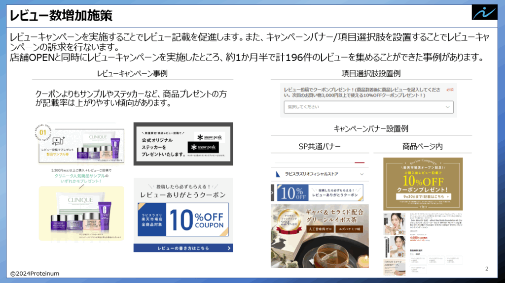 レビュー対策は、クーポンのキャンペーンやプレゼントキャンペーンなどを実施することで、レビューの記載率を高め、蓄積していくことが重要です。