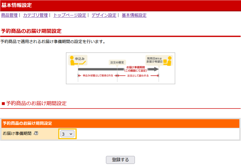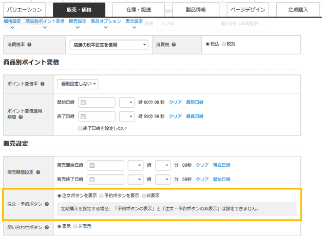 - 推奨設定: 「1日」を設定するのが無難です。この期間を1日より長く設定すると、上記の予約販売日の設定日を変更する必要があるため、ご注意ください。