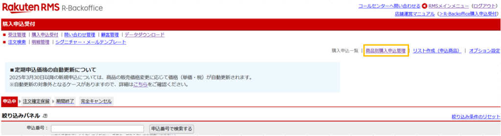 3.「商品別購入申込管理」をクリックすると、対象の商品一覧が表示されます。