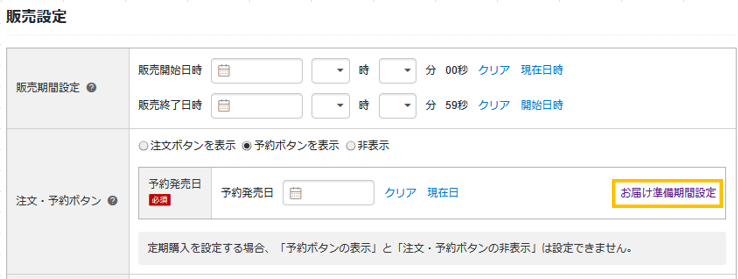 予約販売を実施するためには、「予約発売日」と「お届け準備期間」の具体的な設定が必要です。