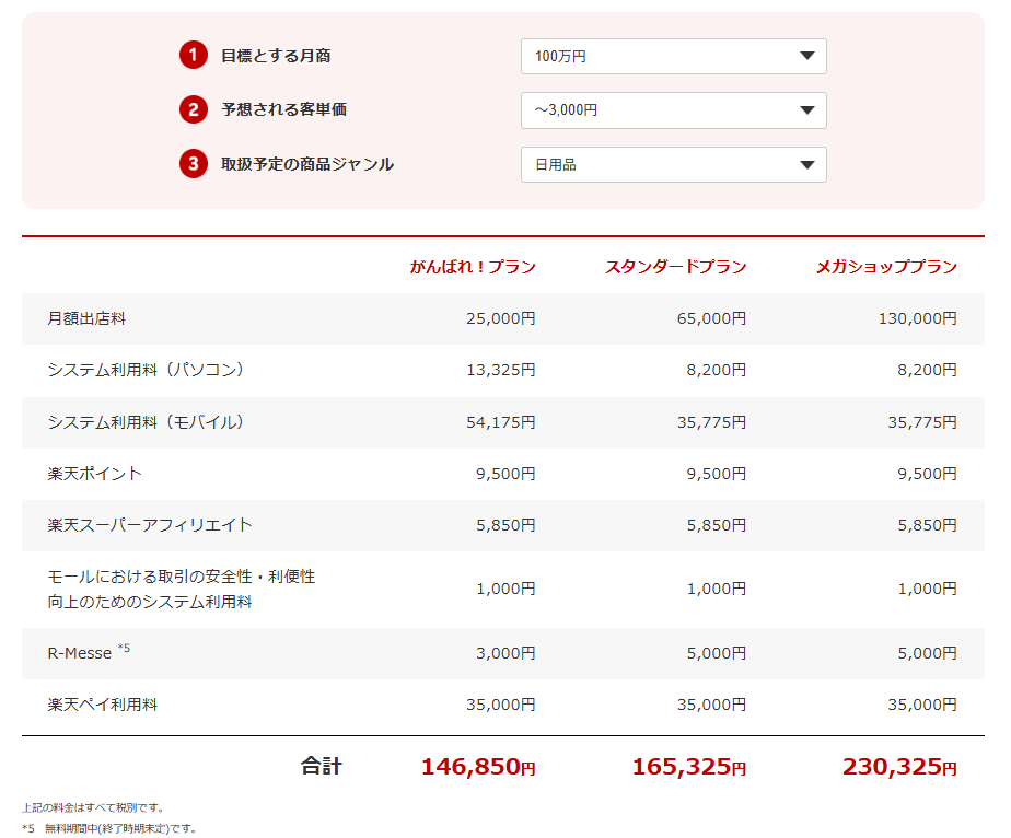 以下サイトから楽天市場にかかる費用のシミュレーションができますのでご活用ください。