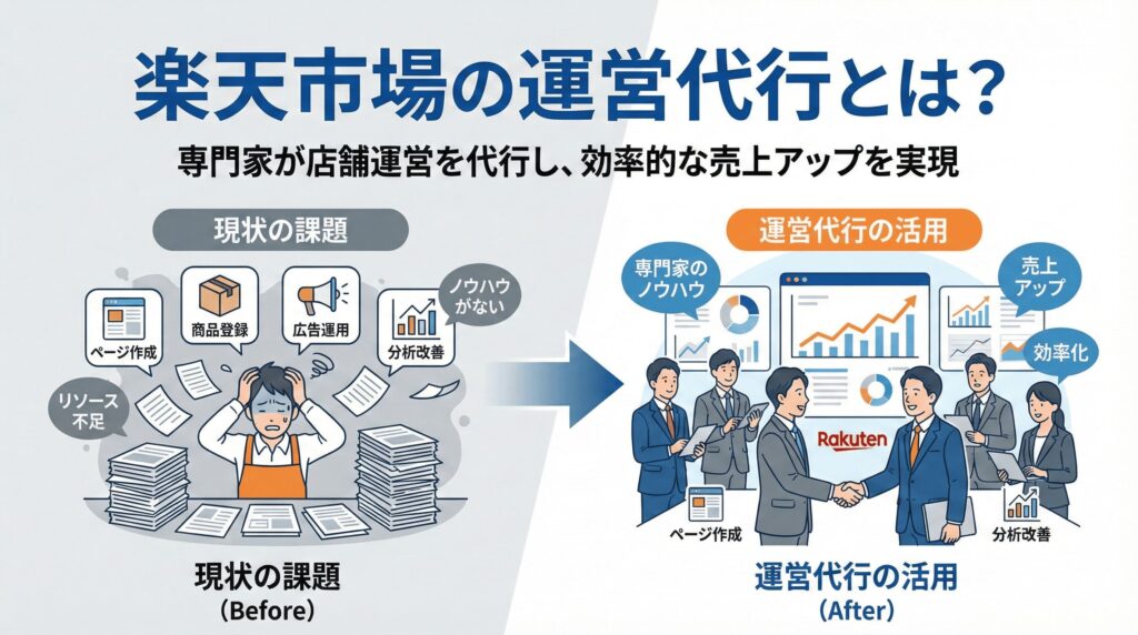 楽天市場の運営代行とは、店舗ページの作成・商品登録・広告運用・分析改善など、店舗運営の一部または全てを外部企業に委託するサービスです。