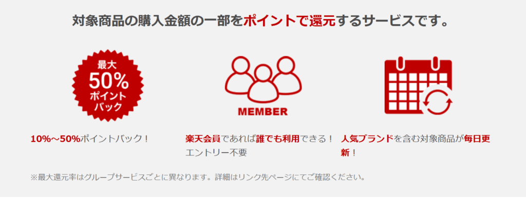 楽天スーパーDEALとは、選定された対象商品における購入金額の一部を高い還元率でポイントバックする楽天市場のサービスです。