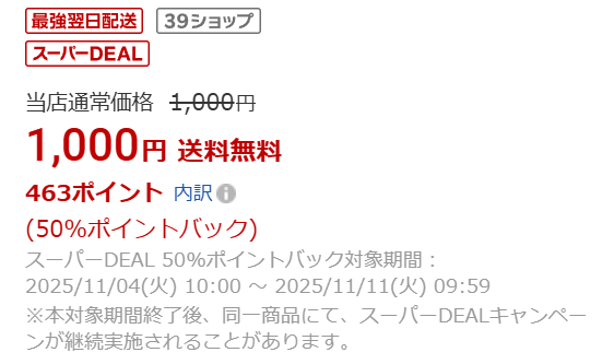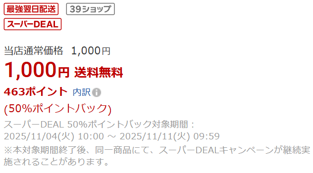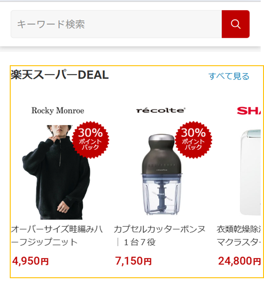 掲載面としては、楽天市場の検索結果で、「スーパーDEAL」というアイコンが付いた状態で表示されます。