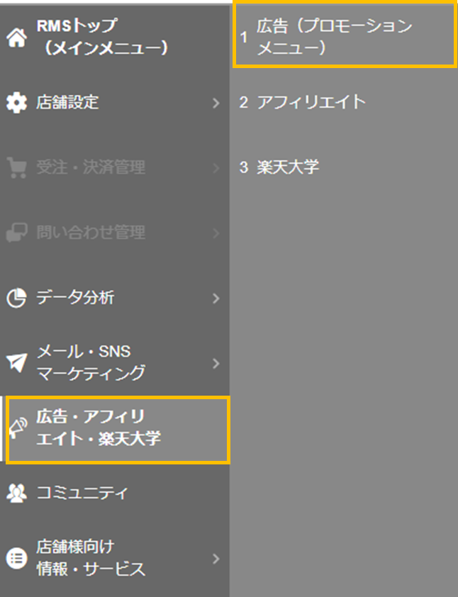 2.画面左側のメニューから「広告・アフィリエイト・楽天大学」を選択後、「広告(プロモーションメニュー)をクリックします