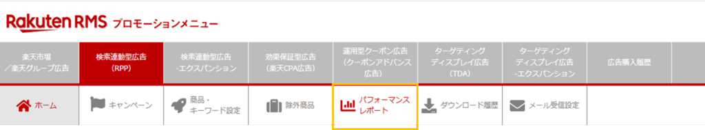 RPP広告のパフォーマンスレポートは以下の手順でダウンロードできます。