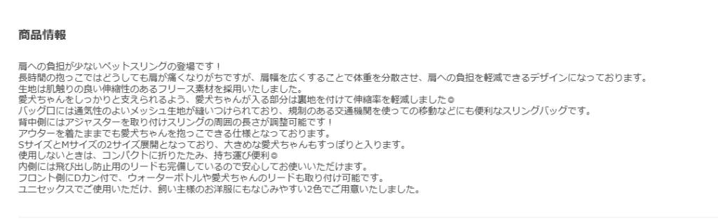 商品説明文に素材やサイズなどの詳細を詳しく記述することで、購買率の向上につながります。