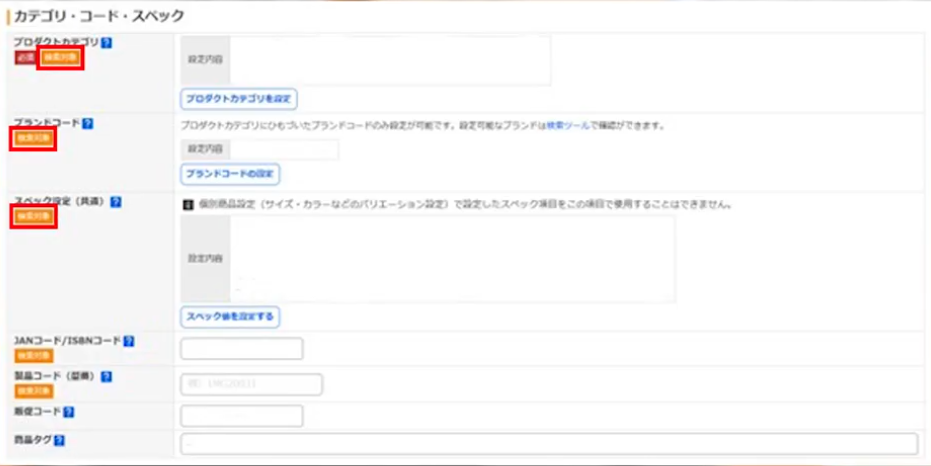 商品ページの編集画面にある「プロダクトカテゴリー」「ブランドコード」「スペック設定」といった必須項目は、単なる情報入力欄ではありません。